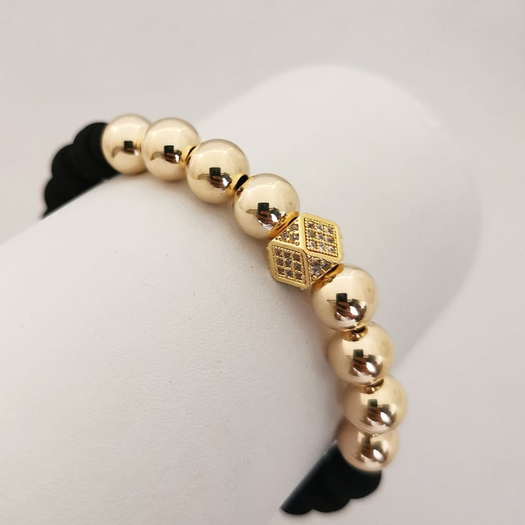 Manillas tejidas en macramé, balines tamaño #6mm liso, 3 Aros Circonio, balines Neopreno con Aro, Oro Laminado 18 k garantía de 7 años.